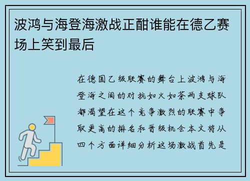 波鸿与海登海激战正酣谁能在德乙赛场上笑到最后